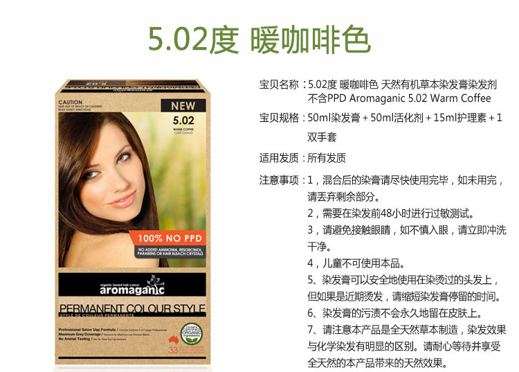 Aromaganic 5.02 纯天然染发膏染发剂 5.02度 咖啡色
