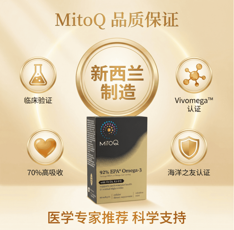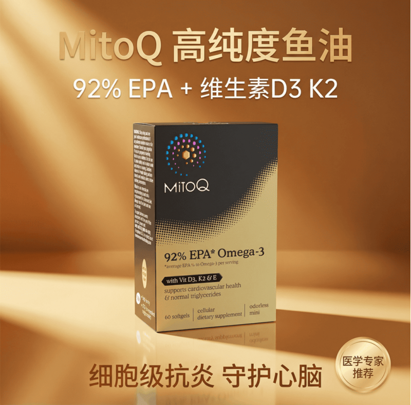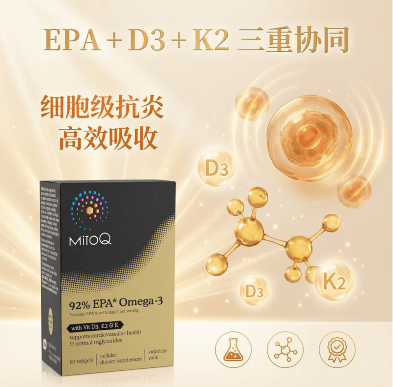 - 英文名称MitoQ 92% EPA Omega-3 With Vit D3, K2 & E 60c