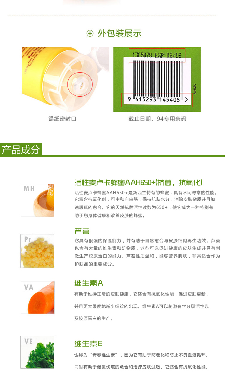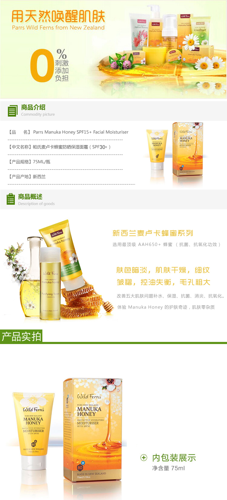 - 英文名称Parrs Manuka Honey Hydrating Moisturiser SPF30 75ml