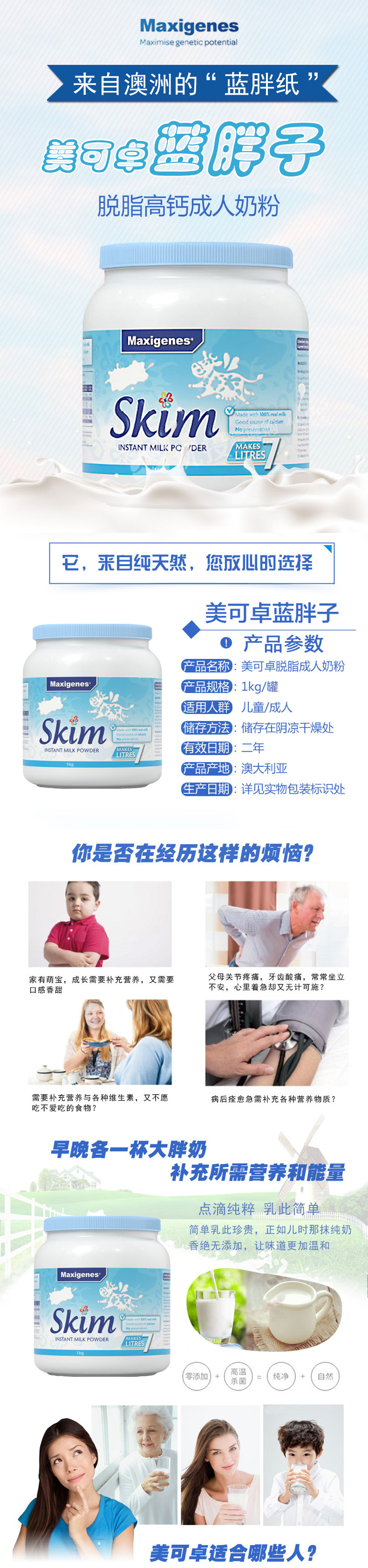 【新西兰直邮包邮】Maxigenes 美可卓 蓝胖子 脱脂奶粉 1kg(3罐包邮)【保质期:2027年3月】