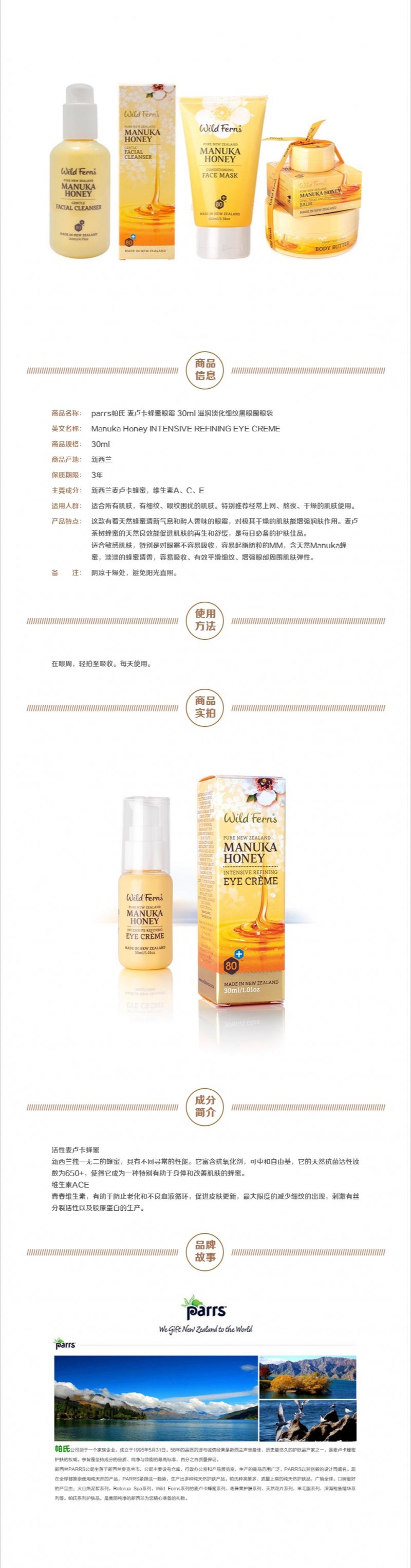 - 英文名称Parrs Manuka Honey Intensive Refining Eye Creme 30ml